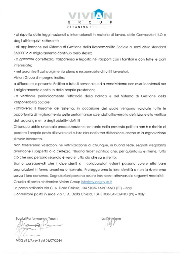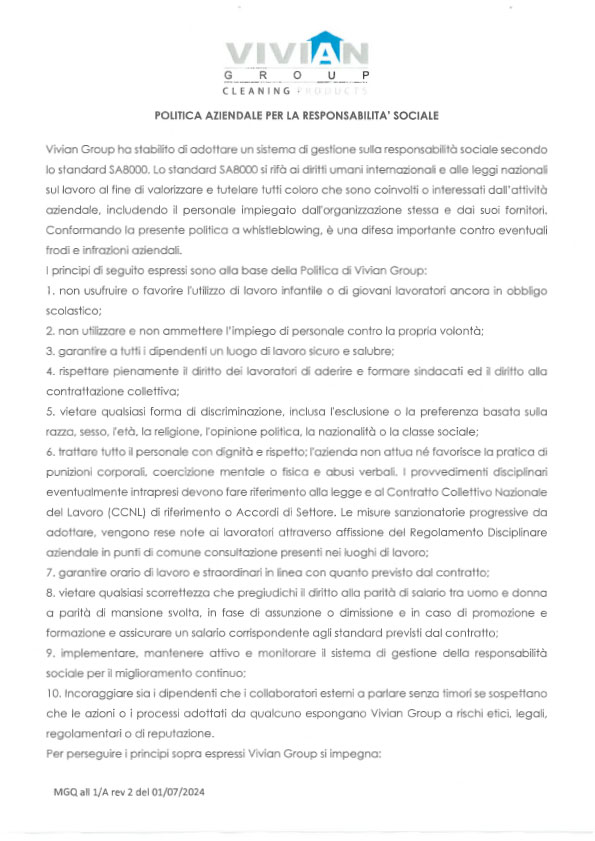 Vivian Group ha stabilito di adottare un sistema di gestione sulla responsabilità sociale secondo lo standard SA8000.
